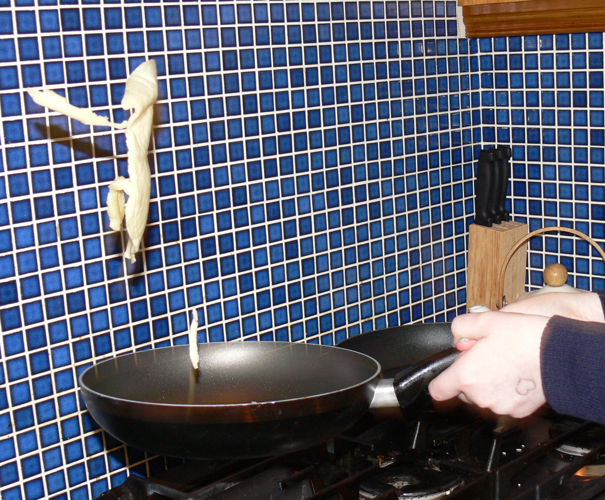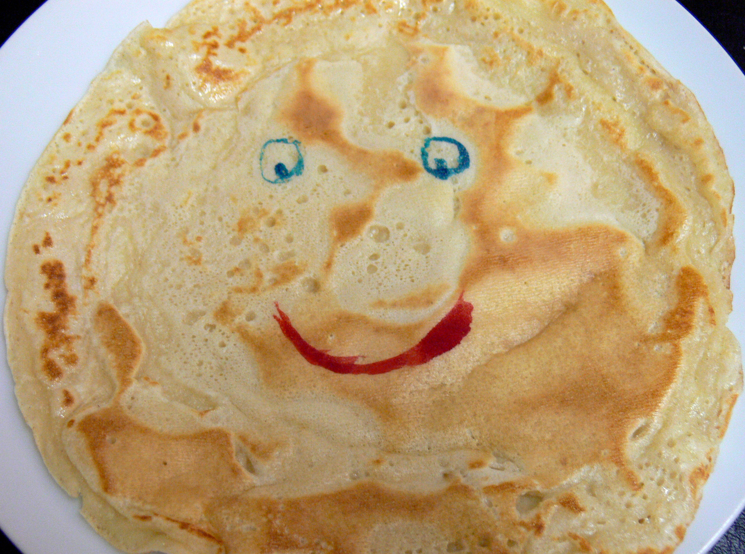 We made our own pancakes. Lucy had to have one as soon as she came home from school. This is her tossing the pancake (it sort of fell to bits!) We think it looks a bit like a monkey, or a person.