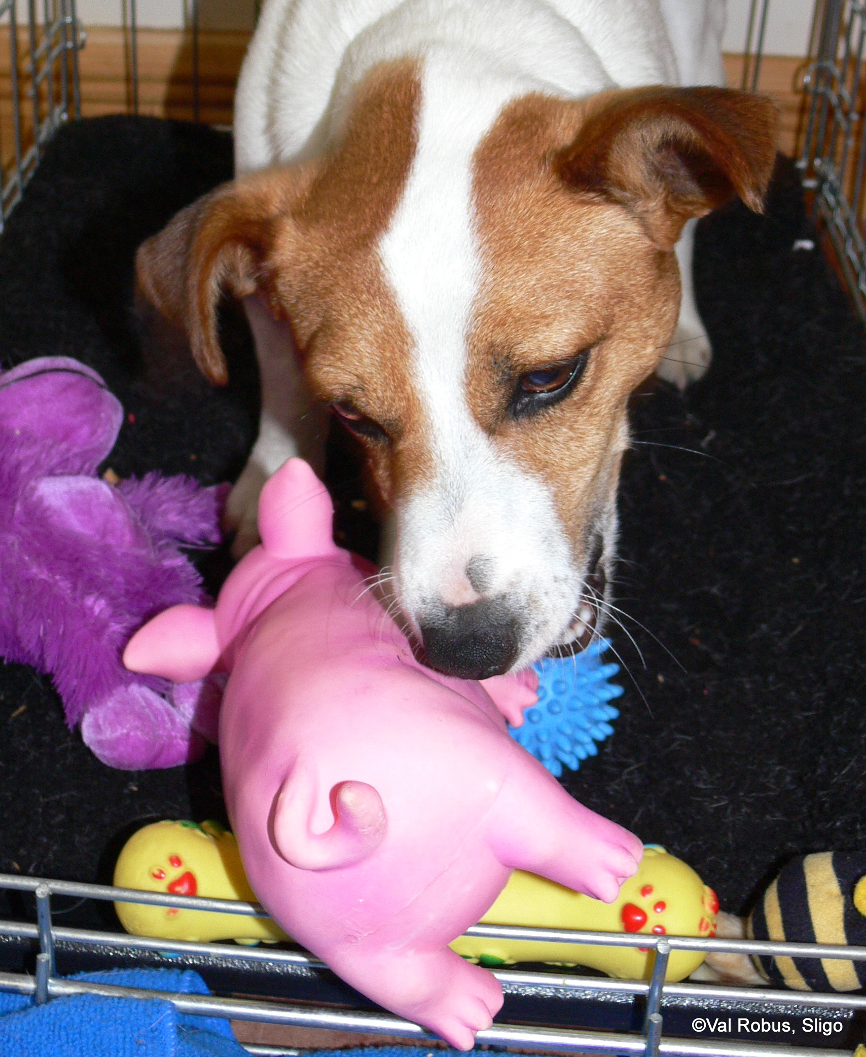Lucy got Rocket a squeaky pig….the only trouble is Rocket has chewed its snout off already! Poor pig.