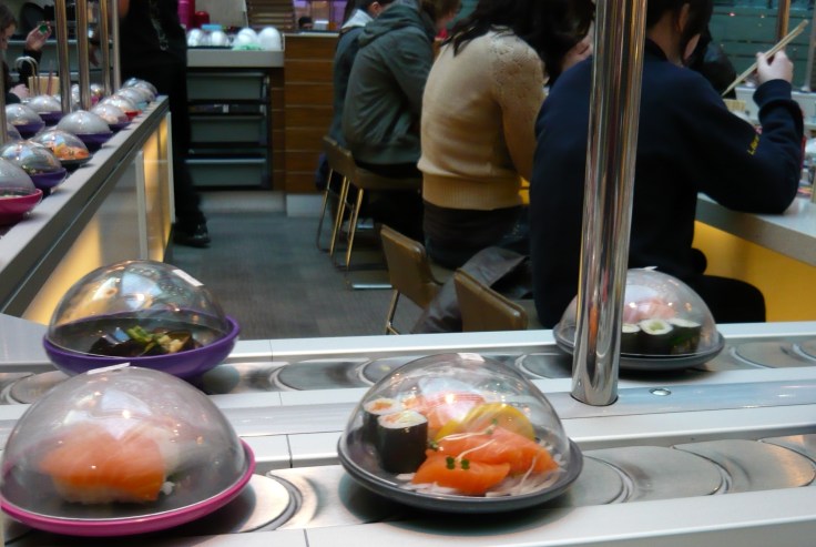 Later in the day we had to check out Yo! Sushi. It was brilliant. All the food goes around on a conveyor belt and you choose what you want. There is a booklet explaining what each food is and the plates are colour coded so the prices vary depending on what coloured plate you choose. Just beware though there are water taps and glasses on the counter but they do charge for the water.