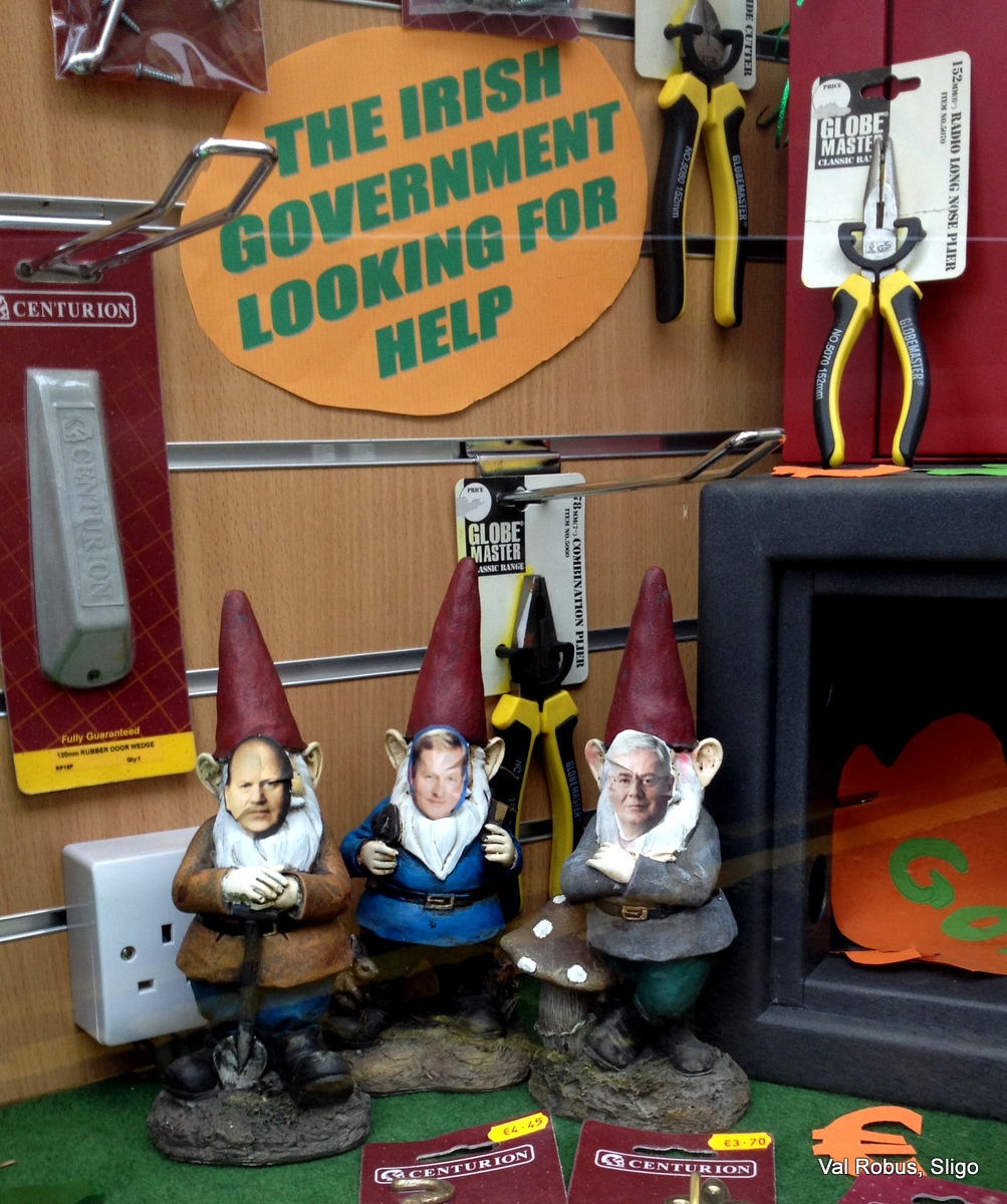 I like the window display that Atlantic Lock and Key have. It’s funny to see the Irish government portrayed as gnomes.