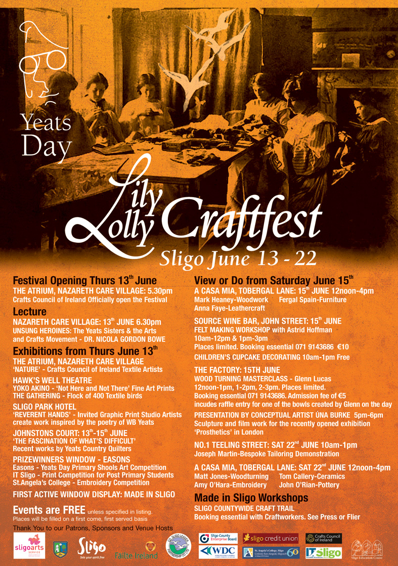 This year the Yeats Day event includes the launch of a 10-day rescheduled and re-branded Craftfest Northwest festival honouring WB’s sisters Susan and Elizabeth – affectionately named Lily and Lolly by her siblings. Susan (Lily) was a keen embroiderist. Elizabeth (Lolly) trained under the renowned artist and textile designer William Morris in London. She was an artist and the main inspiration for the Cuala Press which she ran with her sister. They printed the work of WB Yeats and many other well-known writers including Ezra Pound, Douglas Hyde, Rabindranath Tagore and Elizabeth Bowen. The LilyLolly Craftfest will build on the success in recent years of the Northwest Craftfest. The rebranded and rescheduled festival – promoted by Made in Sligo craft wrokers group – will now be launched on Yeats day every year.