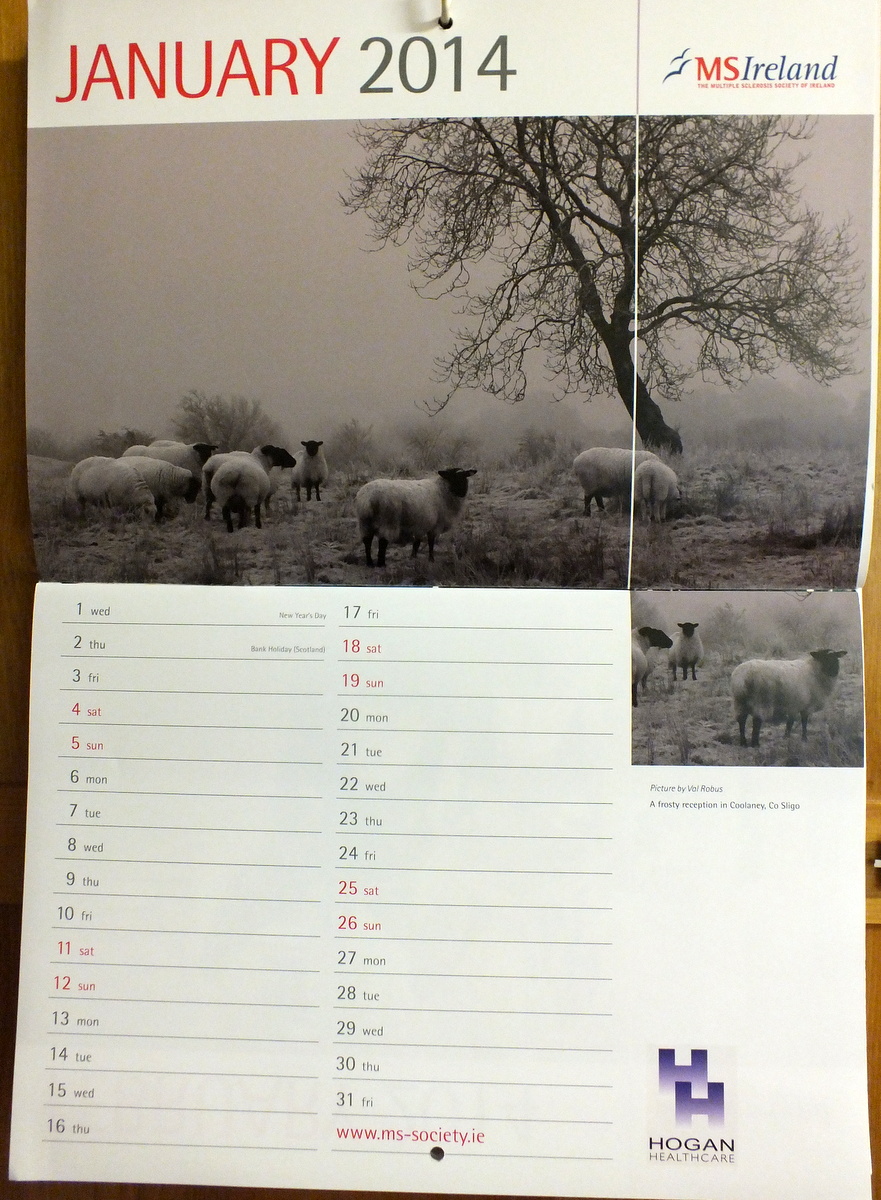 I got my copy of the MS Ireland 2014 calendar in the post today. I’m delighted to see my photo in it for January. Nice to see Coolaney, Sligo featured 🙂 It really is a lovely calendar with a lot of photos that I wish I’d taken. You can buy it online for €6.99 plus postage and you’ll be helping a very worthy cause.