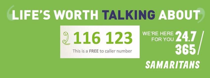 I am a volunteer with the Sligo Samaritans and it’s such a strange, challenging but positive experience. We really need to get the message out in Sligo that you can talk to us. Lonely, sad, confused, depressed or suicidal. Sligo provides a trained 24 / 7 service. All volunteers. The small branch took 30,000 calls in 2013. The main cause of death between 18 and 40 is suicide. Twice as big as car accidents, 75 % male. This needs to stop by talking, helping and supporting all age groups in need and in trouble. Sligo Samaritans have been here for 29 years but yesterday I launched the Facebook page for it. Please help now and whenever you can. I have been there to help and perhaps postpone suicide and so many callers have said that. I have also been there when they had done their farewell and just wanted to be with someone. I am a Dad and while I am in the Samaritans to stop or help prevent that, I have seen it happen very close to me. . It’s not morbid, it’s real. Let’s try to prevent it and let people know that if they are lonely, unhappy, stressed or worse Sligo has a centre that they can call or drop in for a chat. 3 The Mall, Sligo. Or free phone 116123