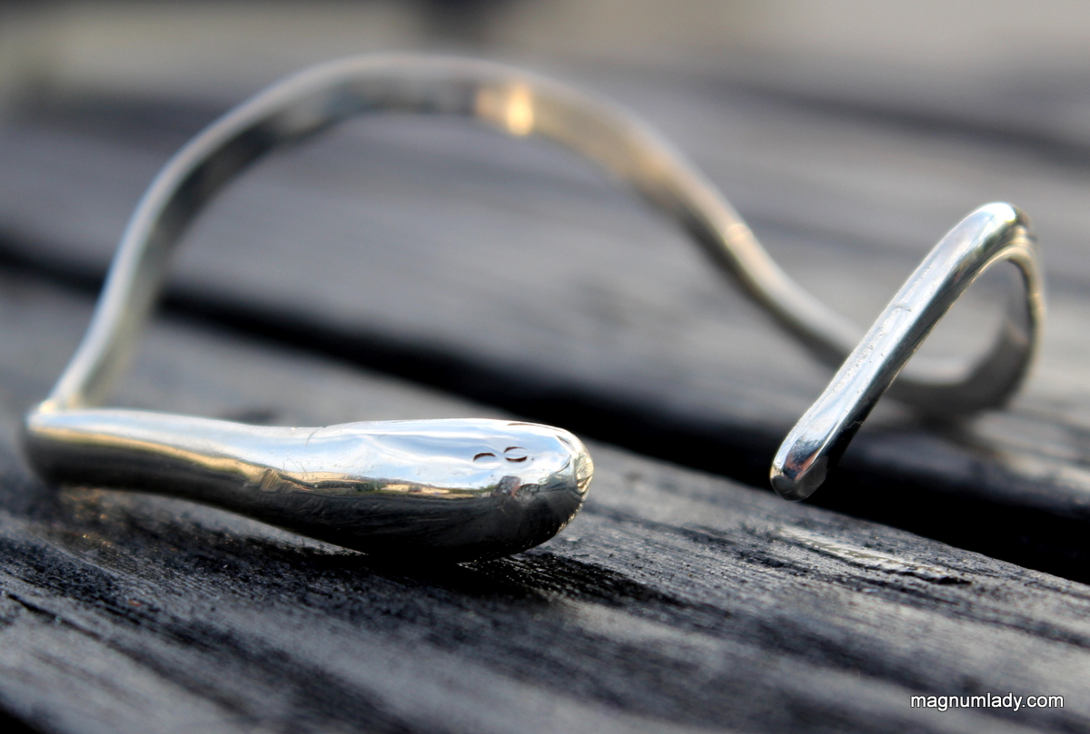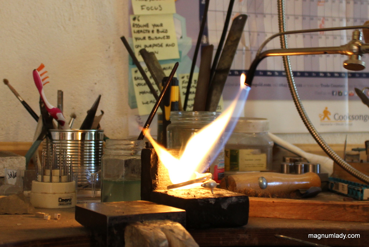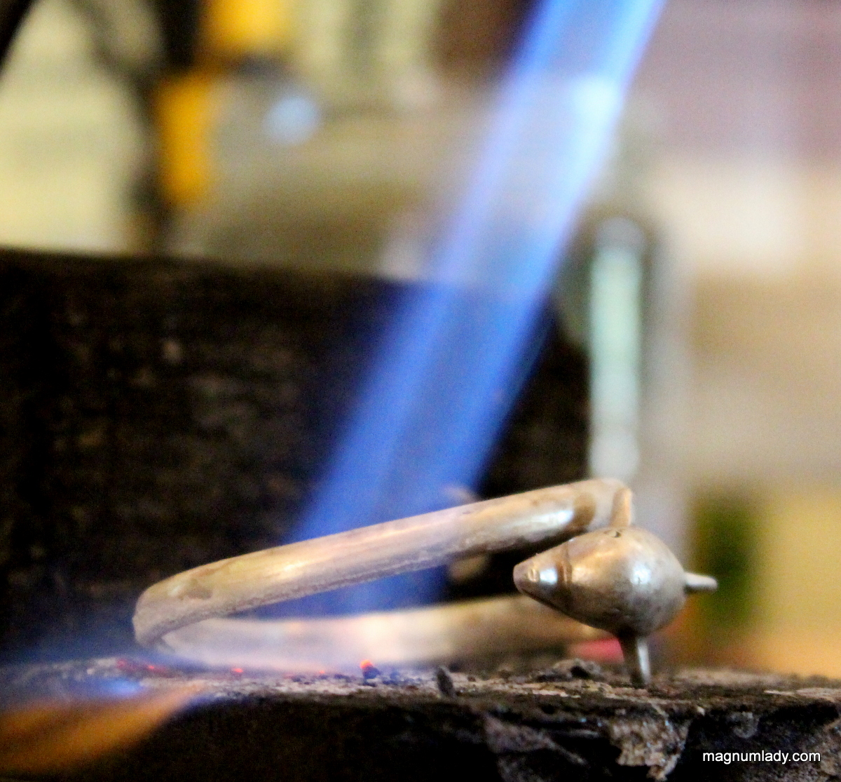 We started with an old dolphin bracelet which had to be heated with a blow pipe torch (which is hooked up to a gas bottle) to make it pliable – note to self blow don’t suck!! Also don’t forget to breathe….I was so busy blowing at one point I did forget to breathe…and take the blow pipe out of your mouth when you do breathe or you’ll breathe in gas! I’m rambling now, but you get the picture.