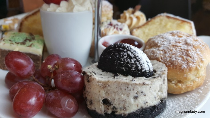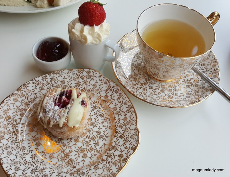 The other two tiers were delicious looking cakes – I’m drooling now just writing this! It was very difficult to decide what to eat first but I went for their signature raspberry and white chocolate miniature scone which was lovely. We also had a plain scone each with jam and cream.