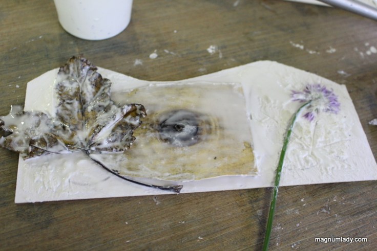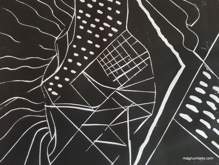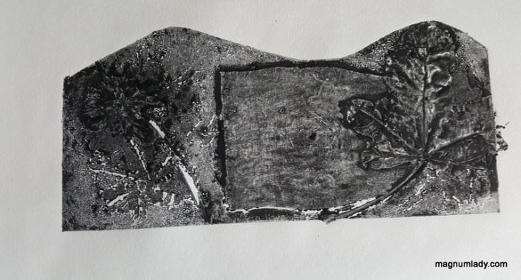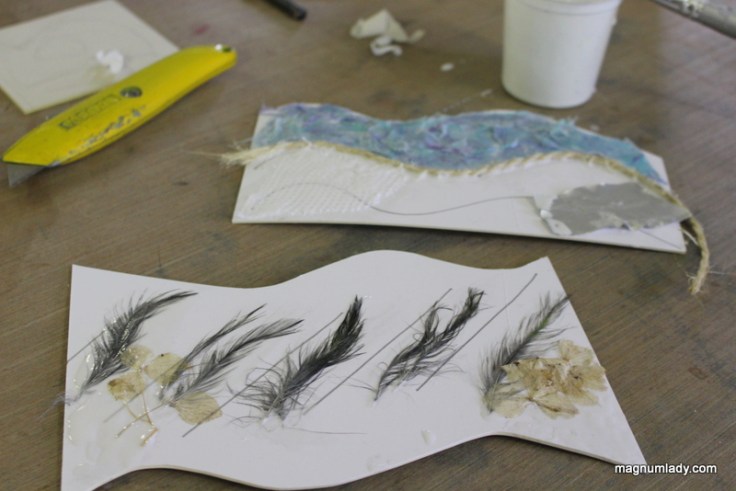 Firstly we started working on collagraphs. This was a new thing to me. You make a printing plate by making a collage of materials glued on card. It’s a long process so we started this first to give it a change to dry.
