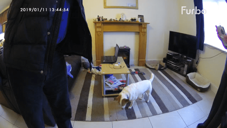 Firstly it was very easy to set up. You download the app on your, connect the device and away you go. I tried it in the house first so I was upstairs and I could see the dogs downstairs. I could even talk to them! And throw them treats, you swipe on your phone and the Furbo throws a treat! It’s such a clever gadget. (Ignore the messy house!)