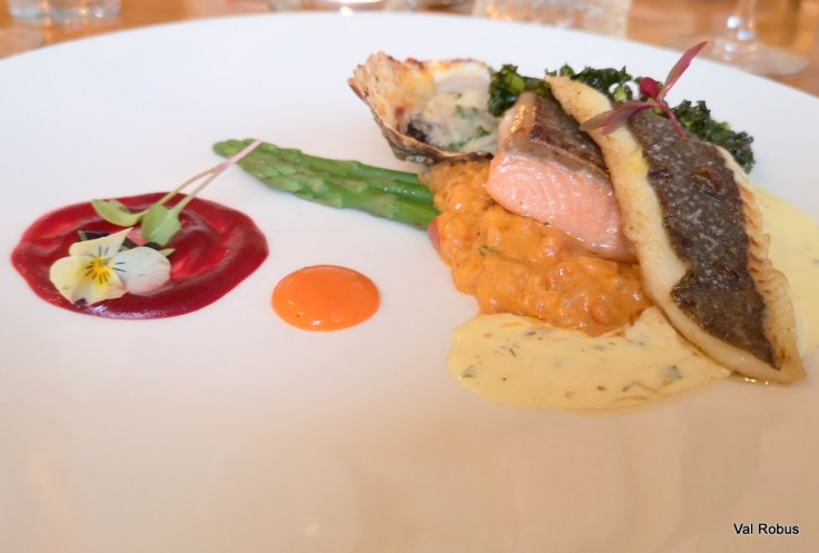 Course 6 was ‘Market Fresh Catch of the Day’. This varies from day to day and how the staff remember the descriptions I’ll never know. I was told but promptly forgot so in my words it was salmon, pan fried plaice, a baked oyster, served with roasted pepper risotto and asparagus. I particularly liked the plaice and the risotto, the perfect combination.