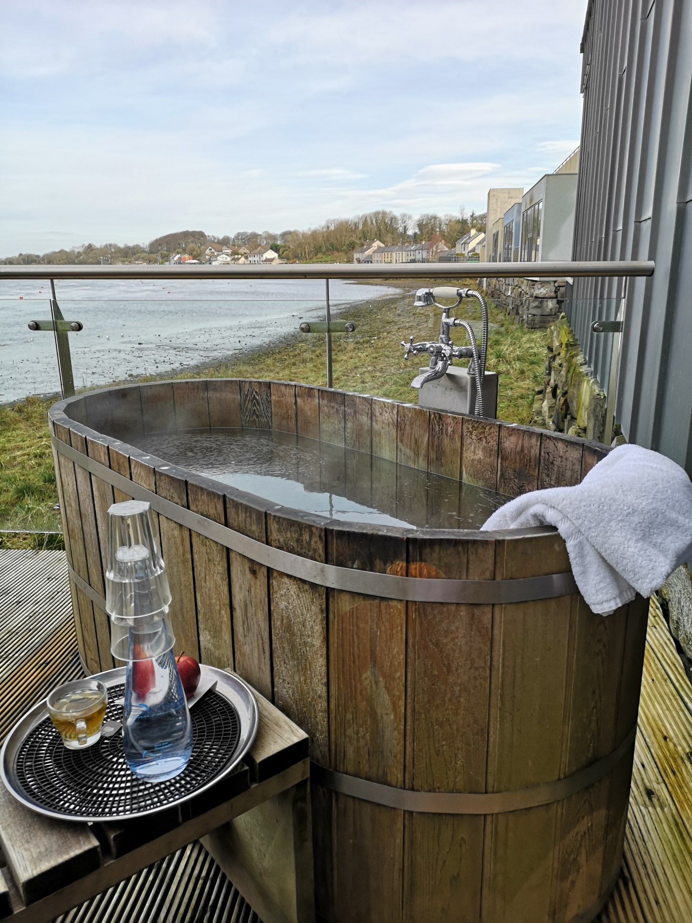 The seaweed bath was wonderful, it was outdoors in a wooden tub on the terrace overlooking the River Moy and not at all cold because the water was so warm. I watched the seagulls swooping, the clouds moving and the river changing colour – from blue to grey and back to blue again. In the distance I could see Belleek Woods with people walking their dogs. It was just so peaceful and relaxing.