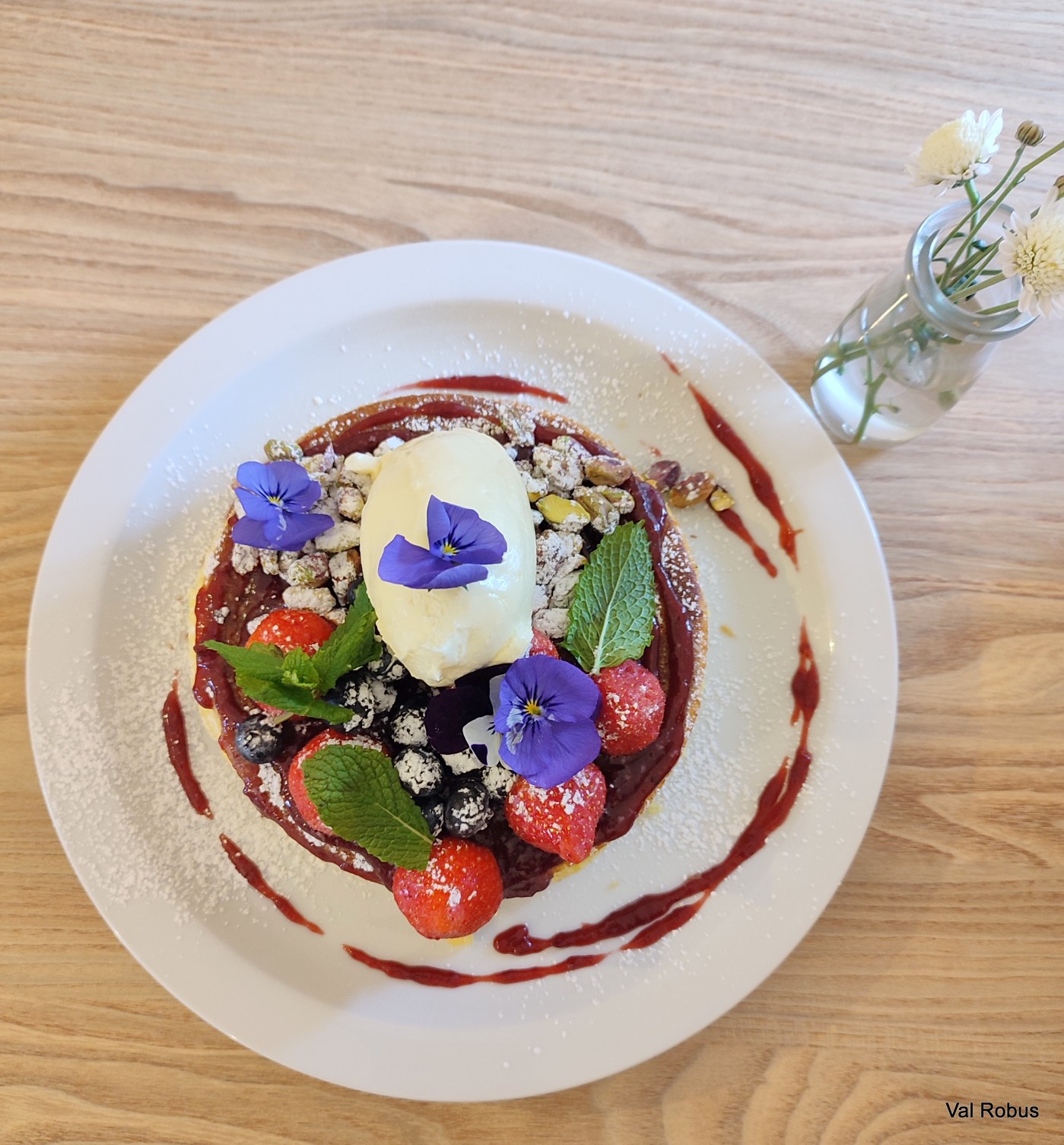 I had the Tempo Pancakes – Ricotta hotcakes, topped with rhubarb and raspberry compote, vanilla mascarpone, strawberries, blueberries, toasted pistachios and edible flowers. They looked like a work of art and tasted absolutely gorgeous.