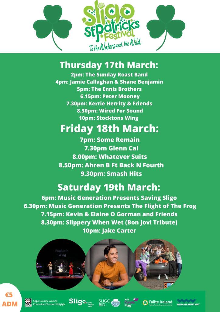 2pm Sligo town, after the Parade on St Patricks Day with local favourites, ‘The Roast Band’ kicking things off. There will be a day full of live music with Irish Folk Legends Stocktons Wing headlining that night.