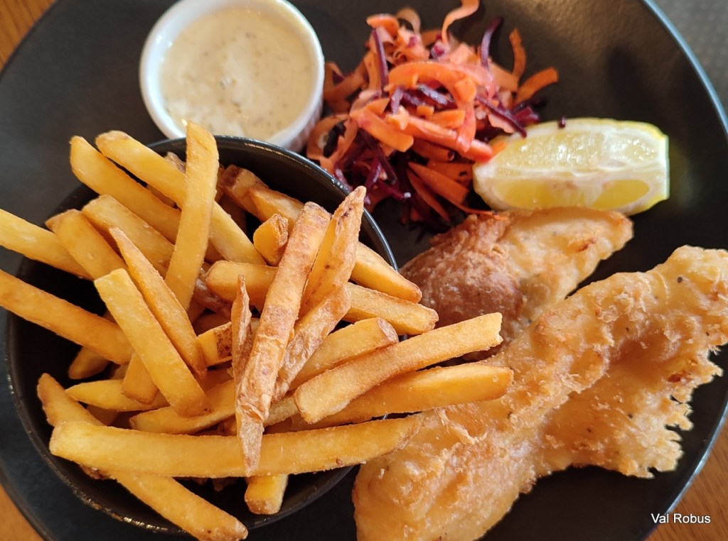Andy had fish and chips, this was ale battered fish, served with a mountain of chips, and freshly made tartare sauce. I tried a bit of the fish, and it was gorgeous.