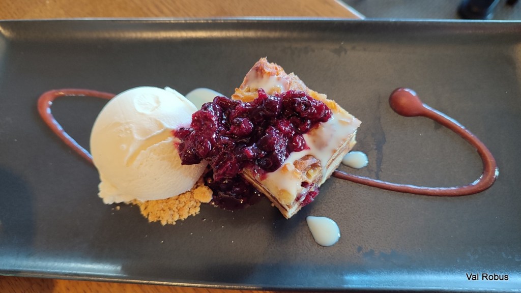 I did, however, have a dessert. You know me and cake 🙂 I had a Pecan Pie, it was fabulous, it came with ice cream and a chocolate straw. Andy had Croissant and White Chocolate Butter Pudding, with raspberries and vanilla ice cream.