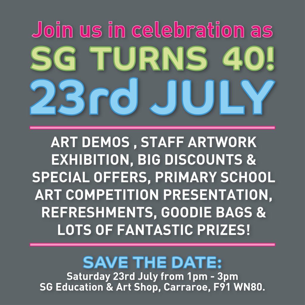 There are great celebrations planned for this Saturday, as SG Education and Art Shop turn 40. You are all invited to come along from 1pm – 3pm and you can read all the details in the poster above.