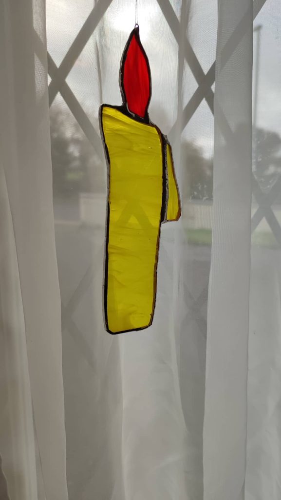 I arrived with all manor of ideas for sun catchers in my head – such as paw prints, cats, unicorns and even Benbulben, but after my test tries at glass cutting I soon realised that none of those would be possible for me. My hand-eye coordination is useless, so I stuck to something ‘easier’.