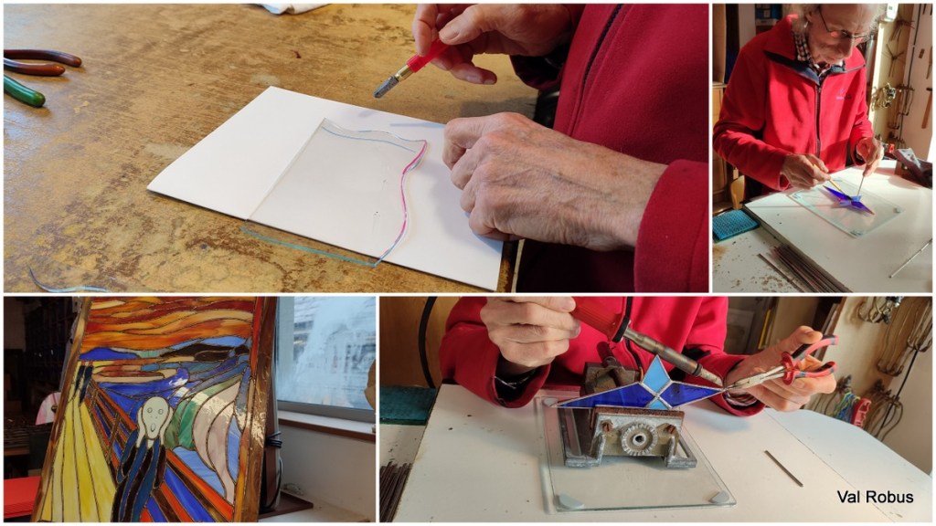 Rainer has a lot of different cardboard templates, so you trace it onto whatever colour glass you choose, and then cut it out. I found the glass cutting very difficult, you need to use quite a bit of pressure, as the glass it thick.
