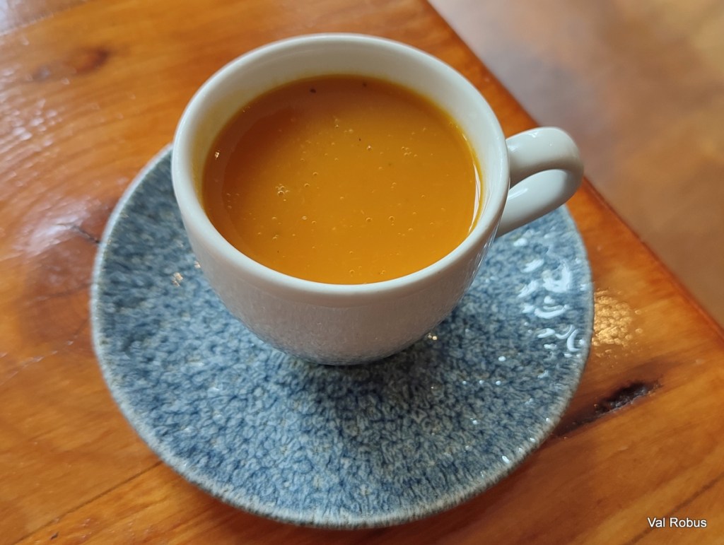 Now to tell you about the food. We were given a complementary amuse bouche of sweet potato and chilli soup – which was absolutely delicious.
