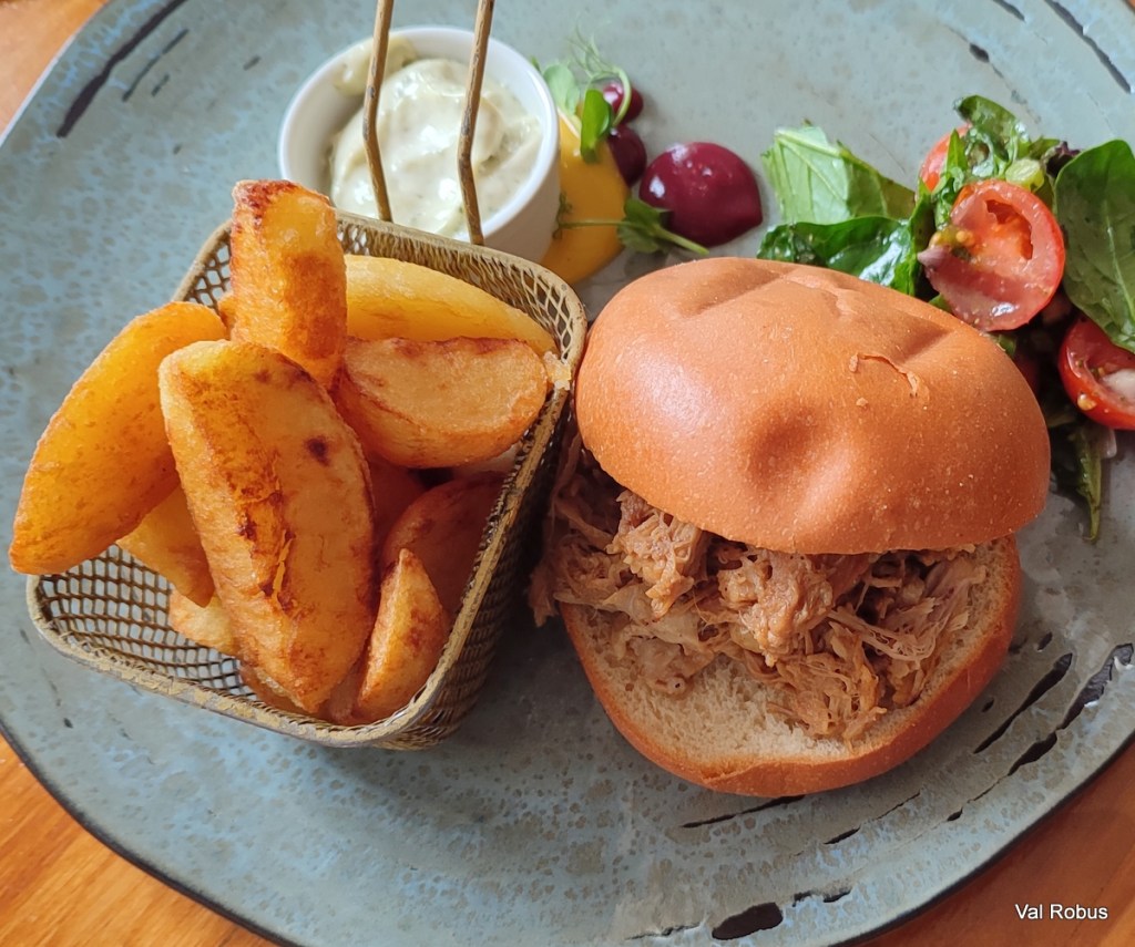 Jono had the pulled pork in Hoisin sauce, which was served in a Brioche bun, with basil pesto and twice cooked chips. He loved it and there were clean plates all round.