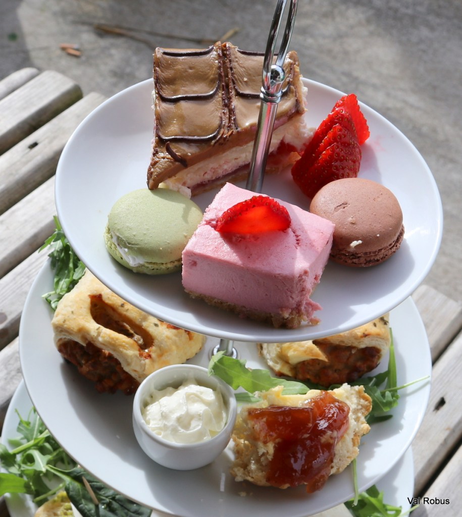 There’s a lovely outdoor area and that’s where I had my afternoon tea, I enjoyed sitting out there listening to the birds singing. The afternoon tea consisted of a selection of dainty sandwiches and wraps, including egg mayonaise, chicken, ham, cucumber, and Mozzeralla and pesto. The sweet selection included scones (the one with lemon curd was amazing), a cream slice – my favourite, cheesecake and macarons. I couldn’t eat everything, so I got it to takeaway and enjoy at home.