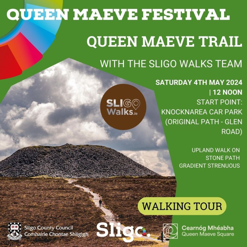 Join 𝗦𝗹𝗶𝗴𝗼 𝗪𝗮𝗹𝗸𝘀 on the Queen Maeve Trail, Knocknarea, scheduled for Saturday 4th May 2024 starting at 12 noon. Start Point: Knocknarea Car Park (Original Path – Glen Road). Bring walking boots, waterproofs, mobile phone, water.