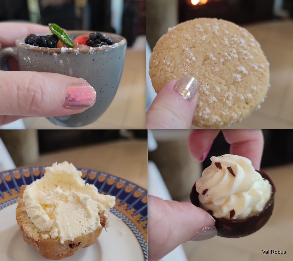 The sweet selection included macarons, meringues, chocolates, scones, chocolate eclairs, chia seed puddings, brownies, shortbread biscuits, and scones. We had a huge pot of tea to go along with it.
