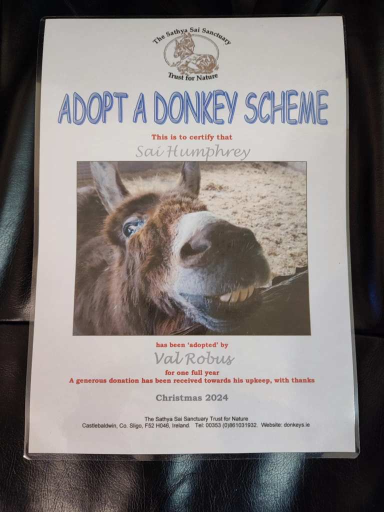 I love donkeys, well I love all animals, and when I saw that Humphrey from the The Sathya Sai Sanctuary was looking for someone to adopt him, I knew that person was me. I don’t actually get to own him, it’s the Adopt-a-Donkey Scheme, and a minimum payment of €20 a year is recommended. It’s a great way to help the sanctuary, and you can find out more here: https://donkeys.ie/html/help.htm I received my certificate today – this would also be a wonderful gift idea. I can’t wait until the sanctuary opens again and I can meet Humphrey.