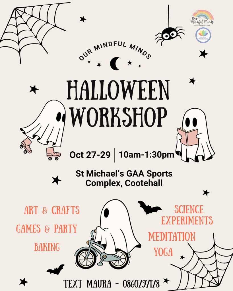 Halloween Mindfulness & Yoga Workshop. October 27th – 29th. Cootehall, Roscommon. For Kids 4-12 years | 3.5 Hours a Day.  Text Maura on 0860797178 to reserve a spot, or for more information.