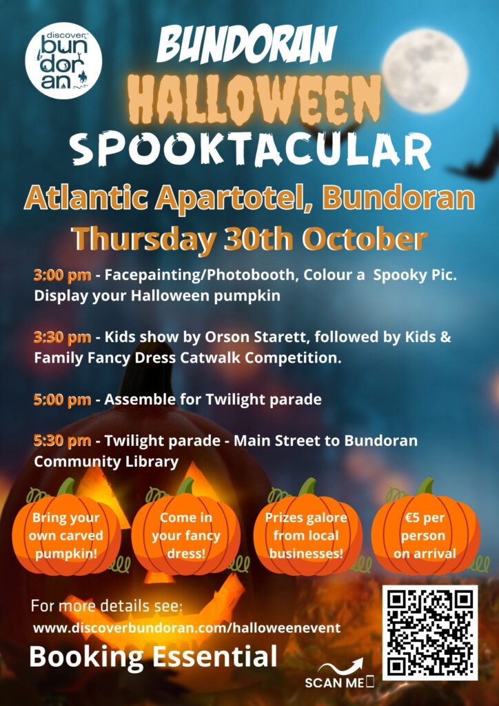 Bundoran Halloween Spooktacular at the Atlantic Apartotel, 30th October, 2025. The family-friendly event will feature a photobooth, a kids’ show with Orson Starett, a fancy dress catwalk for all the family, and a colouring competition. As usual, the pumpkin parade will take place at dusk along Main Street, concluding at Bundoran Community Library, where prizes will be awarded for the best pumpkins and fancy dress costumes. Full details on Discover Bundoran. Pre-booking essential.