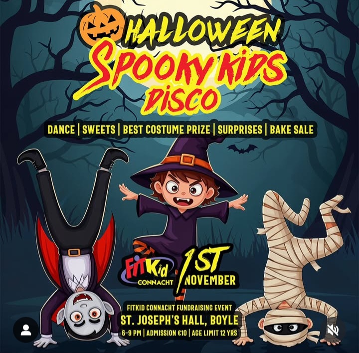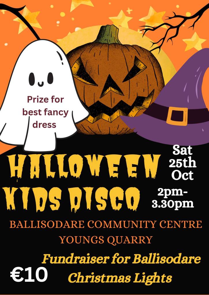 Ballisodare Halloween Kid’s Disco. 25th October 2pm – 3.30pm. More information: https://www.facebook.com/photo/?fbid=1085572607066889&set=pb.100068424793771.-2207520000