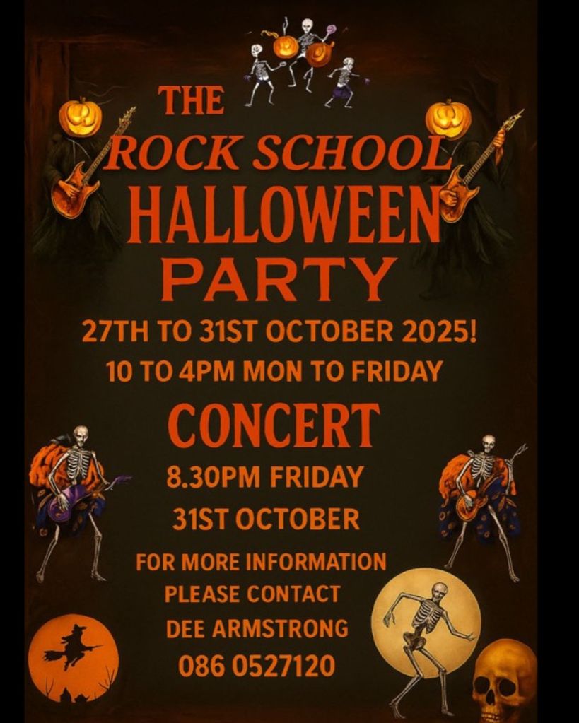 The Rock School Halloween Party. 27th – 31st October, followed by a concert on the 31st. The Glens Centre, Manorhamilton. For more information please contact Dee Armstrong 086 0527120.
