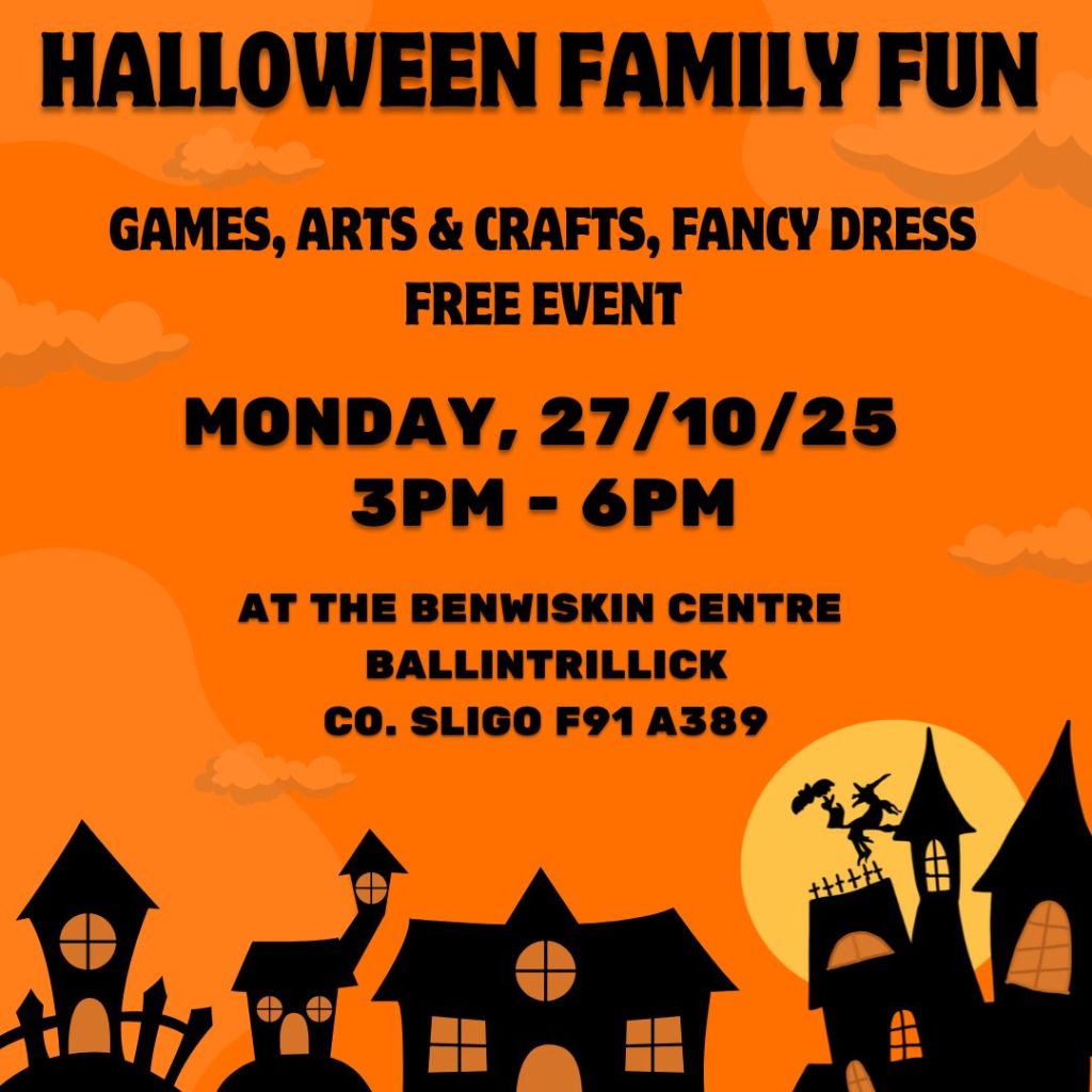 Monday 27th October. 3pm – 6pm. Family Fun event at the Benwiskin Centre, Ballintrillick, North Sligo. Free event. Fancy dress, games, art activities, tea, coffee and treats.