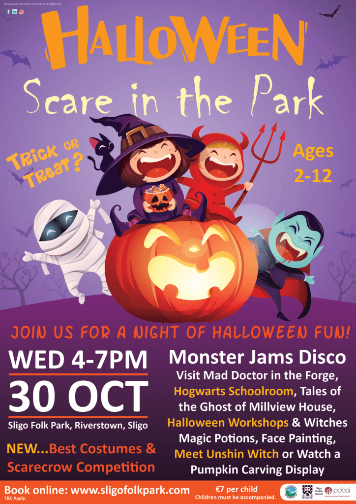 30th October The Sligo Folk Park is delighted to announce the the Scare in the Park is back in 2025.  Call into the Sligo Folk Park on Thursday 30th of October for a scarily good time.