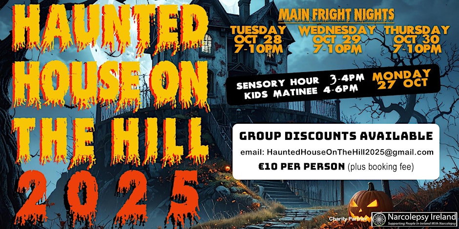 Haunted House on The Hill. Ballina. 27th – 30th October. I’m told this is a great fun. Full details and booking: https://www.eventbrite.ie/e/haunted-house-on-the-hill-2025-tickets-1664593095759?aff=oddtdtcreator