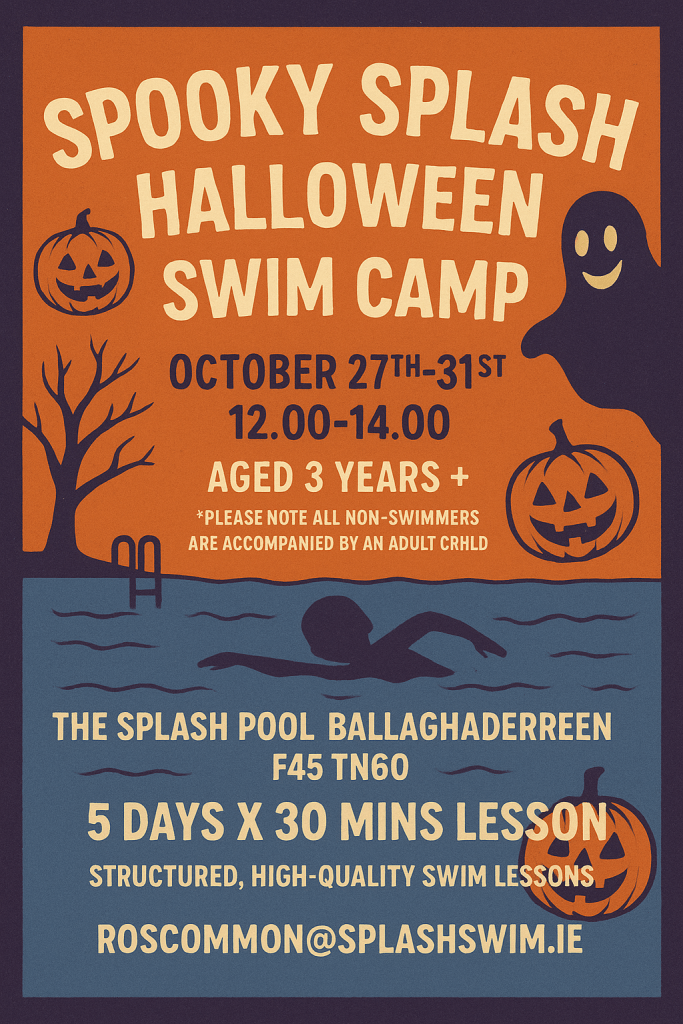 Ballaghaderreen Splash Pool Halloween Swim will take place daily over mid term, for five days. The age category is for 3 years + and please note all beginners require an adult in the water with them. One adult per child. Email roscommon@splashswim.ie to book. They also have a Halloween Colouring Competition taking place, pick up the picture from The Splash Swim School and drop it back. Two people will win a free place on the swim camp (closing date Oct. 20th).