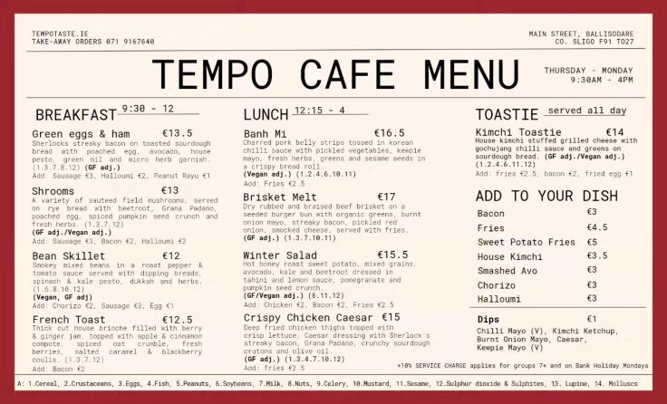 Tempo has launched their new menu. Breakfast is served 9:30-12 and lunch 12:15-4 Thursday – Monday