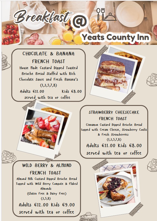 Yeats County Inn in Curry have some new additions to their extensive breakfast menu. I went on Saturday and treated myself to the chocolate and banana French toast. It was amazing, and I loved that it came with tea or coffee too. The menus above are served 8am to 12 Noon Saturday and Sunday.
