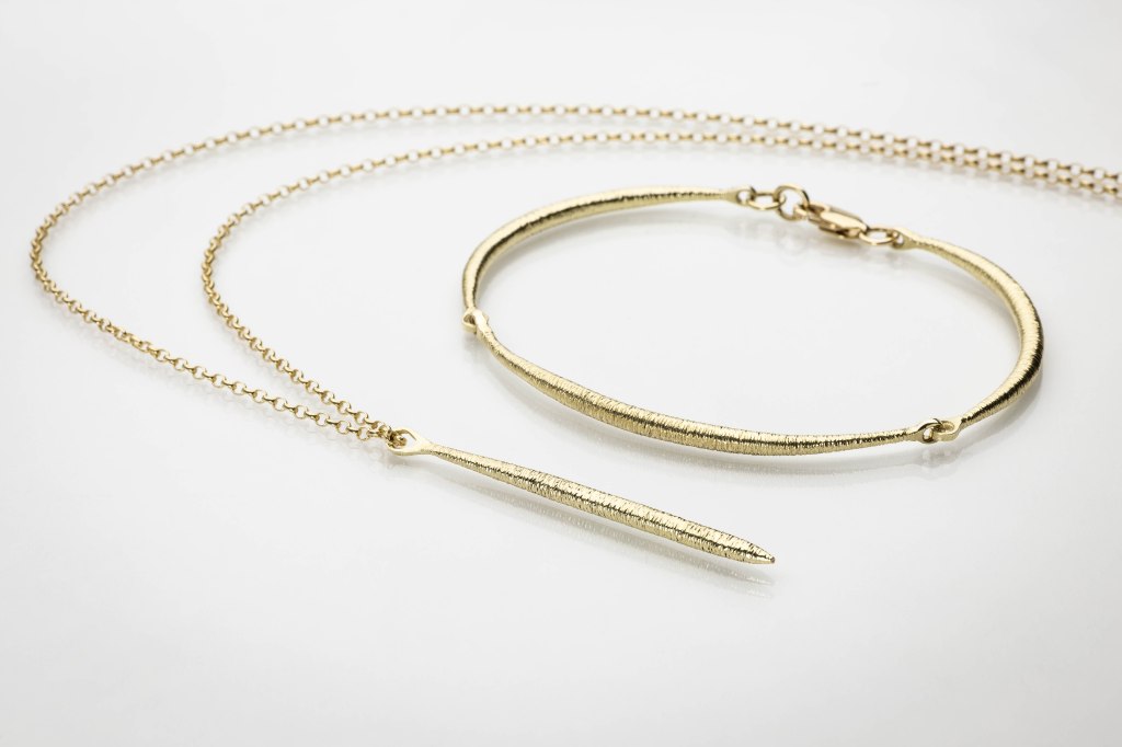 In form, the collection features spindle-like shapes and torc-inspired formations reminiscent of Bronze Age style; bold yet elegant. Each design reflects Martina’s signature textured surfaces and organic lines that echo Ireland’s rugged coast. Pieces are handmade in Sligo from recycled silver and gold, hall-marked for authenticity and sustainability.