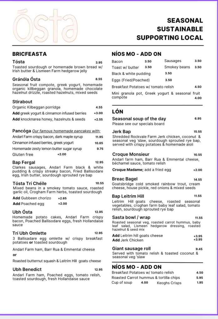 Ósta has a new menu. I love the sound of the breakfast potatoes, and the homemade potato cakes, so I think I’ll have to treat myself one morning. You can find them alongside the river in Sligo town. They are open daily from 7.45 am and open until 7pm on Thursday & Friday. It’s worth remembering that they have a music session from 5pm – 7pm on Thursday evenings.