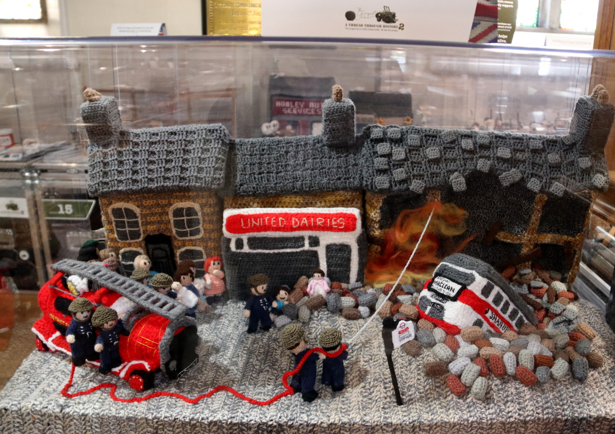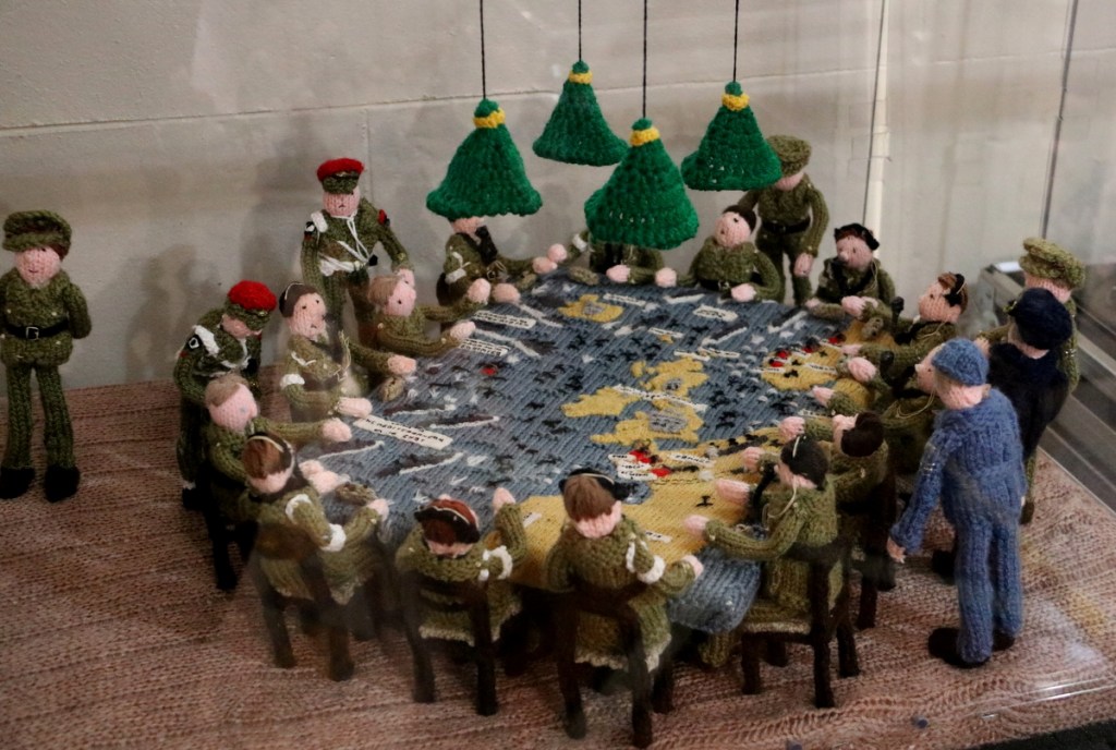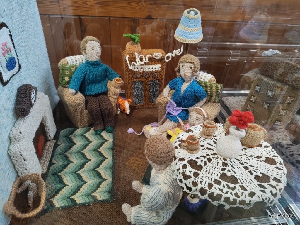 soldiers preparing to land, paratroopers dropping from the sky, medics helping the wounded, civilians ‘digging for victory’, and even food rations. And all of it every tank, every uniform, every tiny figure is made from yarn.
