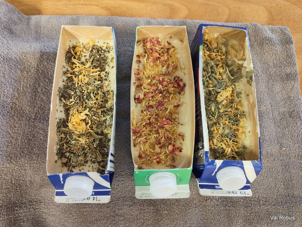 Once everything was mixed, we poured our soap mix into old milk cartons (such a clever idea) and wrapped them up in a towel. I was amazed at how much heat they generated, it was like holding a hot water bottle.