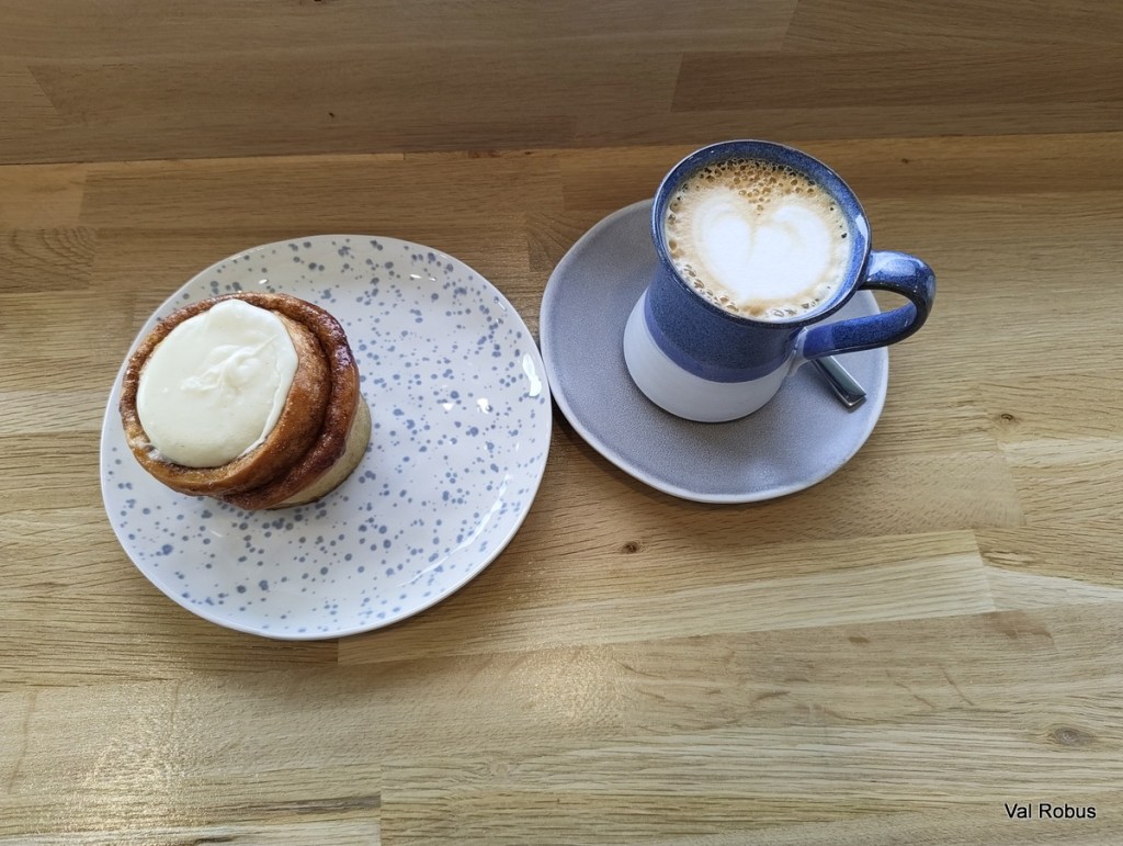 First things first: the coffee. They’re serving Carrow Coffee, roasted locally, and absolutely gorgeous. You can choose from standard coffees – americano, latte, etc, or you can go for something a little bit special, including cinnamon cappuccino, hazelnut choco mocha, iced vanilla matcha, and more. I had a salted caramel latte, and a cinnamon roll – and they were delicious.